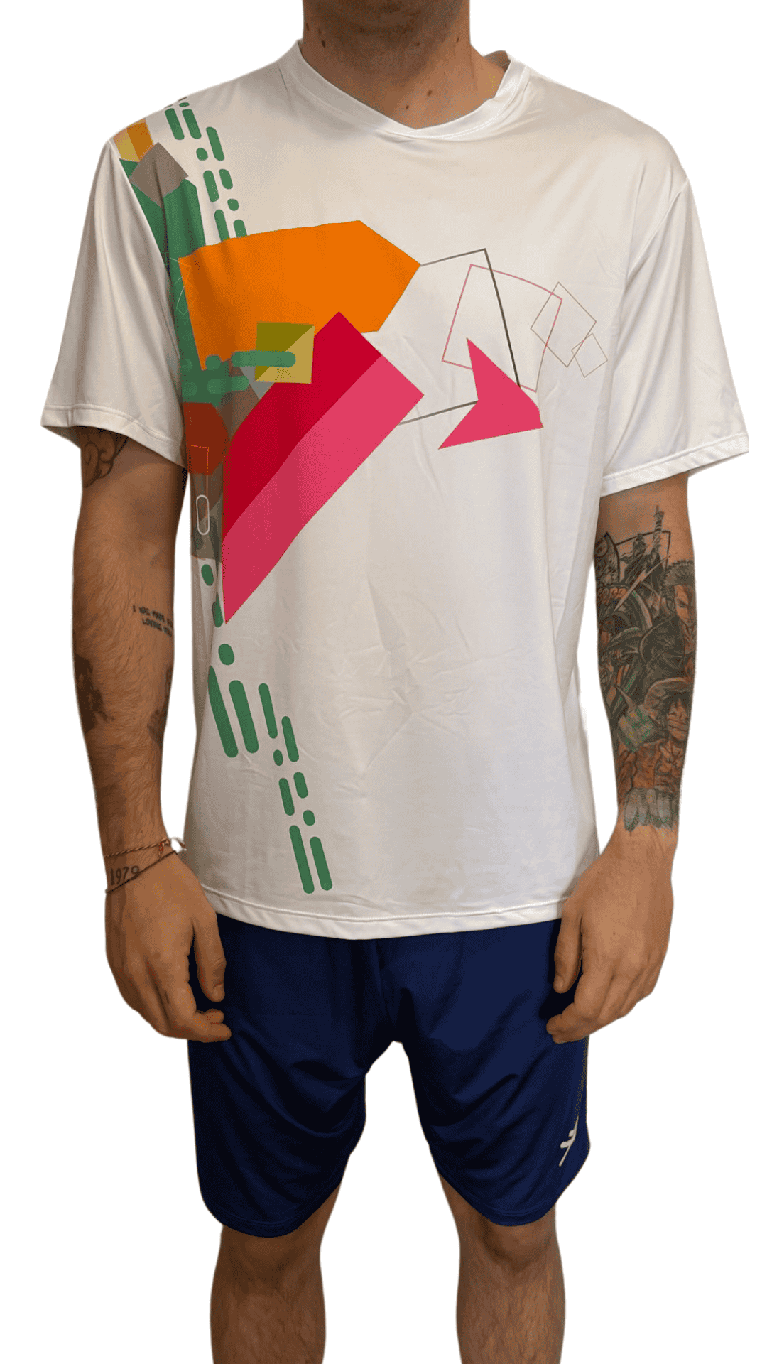 La camiseta Sun Rise celebra el color y la energía de un nuevo día al aire libre. Su estampado geométrico evoca la salida del sol, combinando diseño vibrante con tejido técnico de alto rendimiento.
